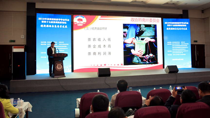 陈劲教授、王礼全研究员、魏明禄博士、王秀峰与李晓红教授分别作了《创新与高质量发展》、《贵州70年发展的历史逻辑》、《突出特色,做强产业—以黔南茶产业发展为例证》、《贵州经济高质量发展的“三化”路径研究》和《2020年后贵州扶志扶智思考》大会主题报告。五位专家结合自己的研究领域全面、深入地探讨了贵州经济高质量发展面临的机遇与挑战,全方位、多视角地为贵州经济发展献计献策。