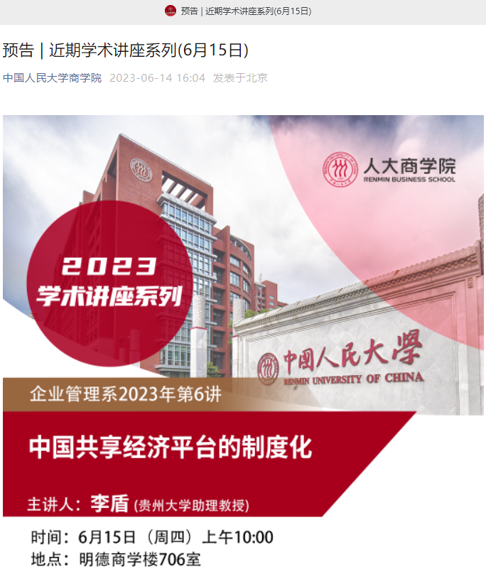 6月15日,管理学院李盾博士应邀前往中国人民大学商学院,开展学术交流。
