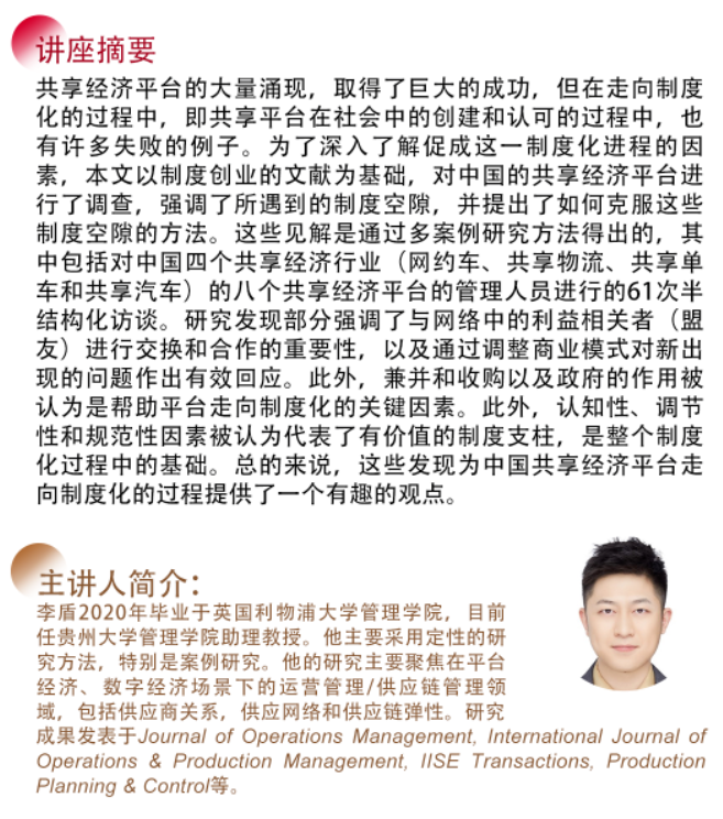 这次学术交流主要聚焦于中国共享经济平台的运营管理机制,特别探索了在中国共享经济场景下,平台如何克服制度空隙,最终实现制度化的过程。新利网页版,新利(中国)官方在线登录近年来一直致力于高质量发展,研究成果发表在UTD24,ABS4*,ABS3*等期刊。