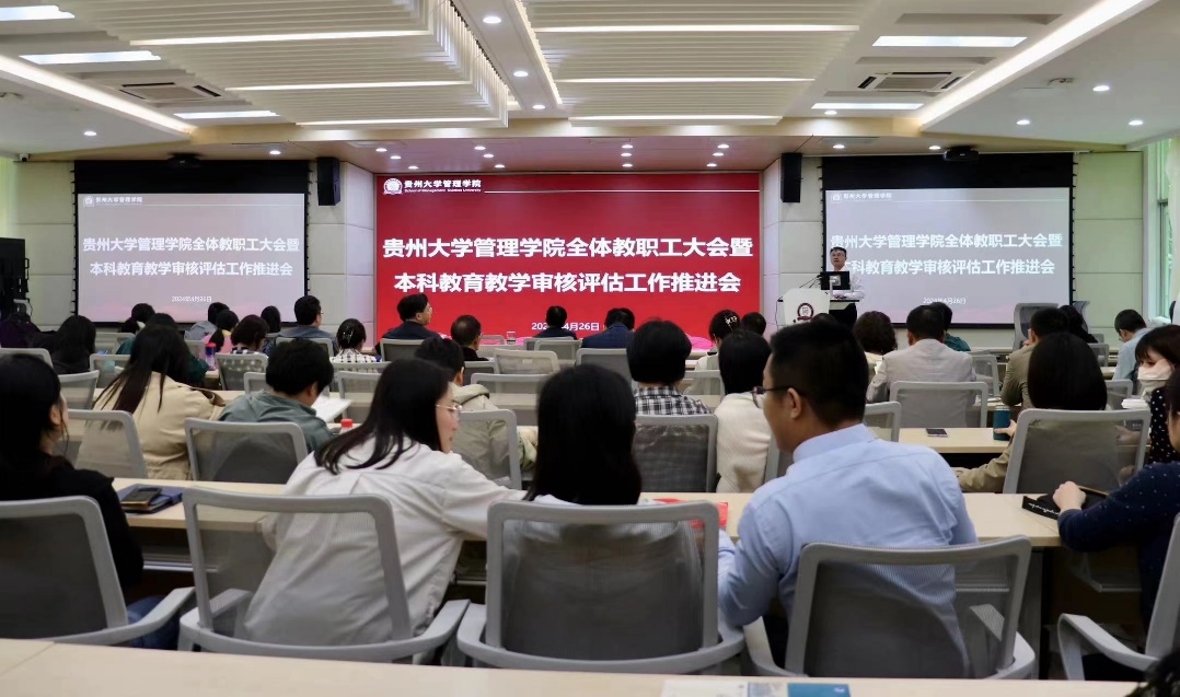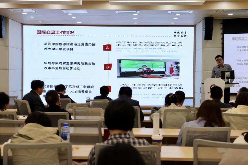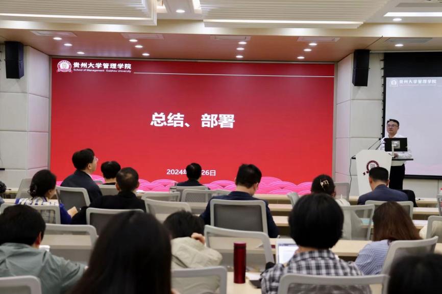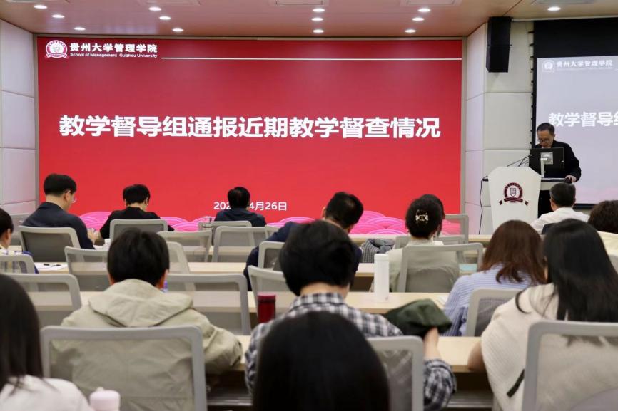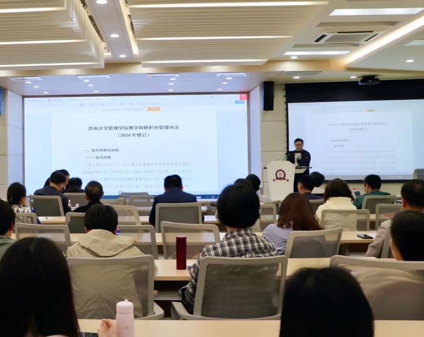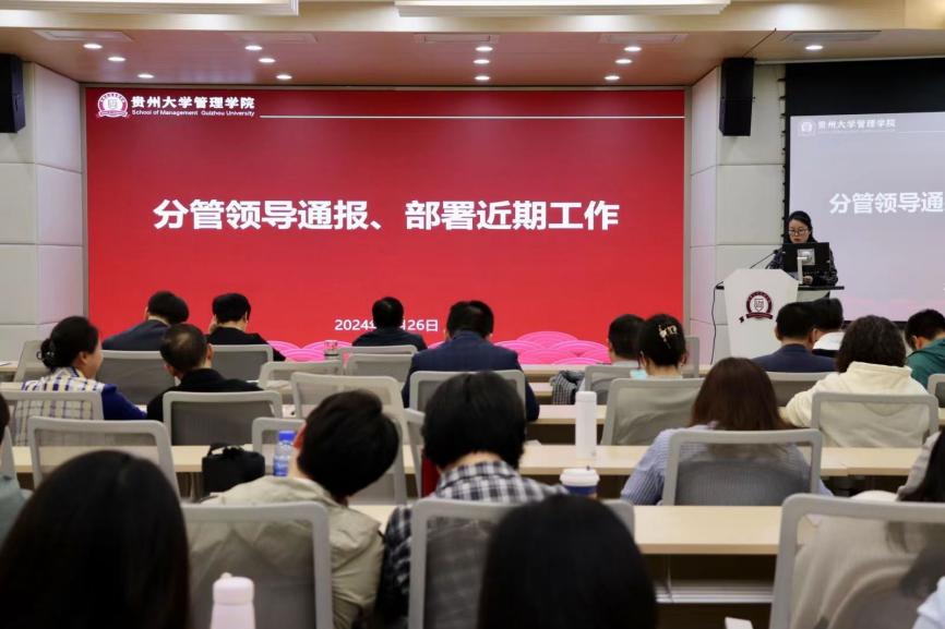 分管领导通报、部署近期工作。学院副书记邓琳就学生就业情况、保研考研情况、团委工作、学科竞赛工作、资助工作以及招生工作、纪检工作进行了通报和部署安排;副院长许为宾从国际交流工作、实验室与案例研究中心工作和本科教育教学审核评估工作三个方面对4月份工作推进情况进行了详细通报,并对下一步工作进行安排部署;副院长李本光就《新利网页版,新利(中国)官方在线登录教学科研积分管理办法(2024年修订)》《贵州大学本科生导师制管理办法(修订)》《管理学院2024年学术型硕士研究生指导教师资格年审工作方案》等重要文件作了通报和传达,强调要将文件内容落实到具体工作中去。