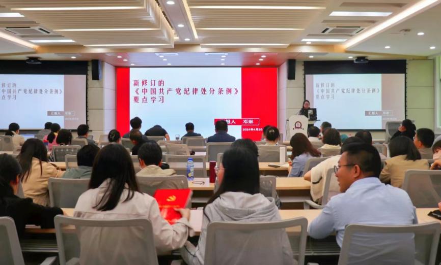 在党纪学习教育环节,院党委副书记兼纪委书记邓琳带领大家对新修订的《中国共产党纪律处分条例》进行了学习。主要从新条例的制定与修改过程、修订的主要内容、新条例修订的主要意义以及如何做遵纪守法的党员四个方面进行详细阐述和学习,并督促全体教职工特别是党员同志要自觉增强纪律意识,严于律己,遵纪守法。