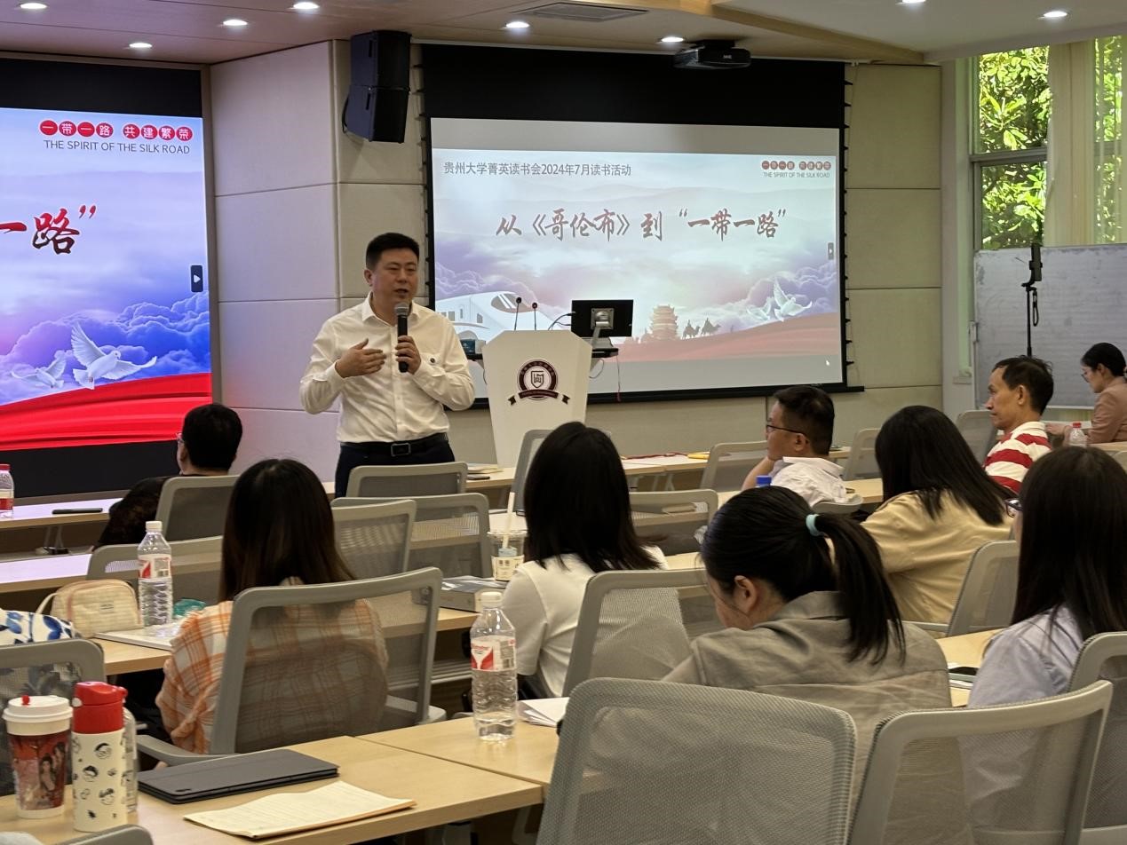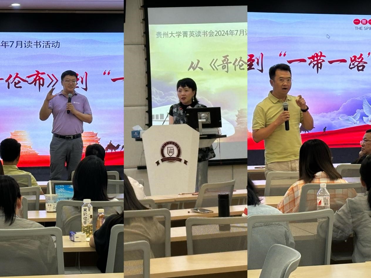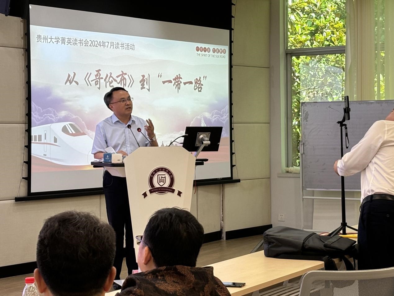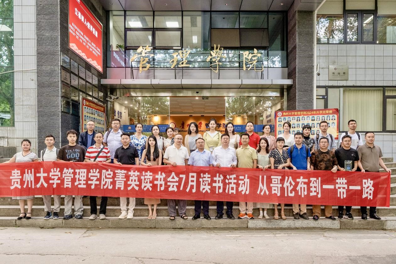 202476日,贵州大学管理学(EMBA&MBA&EDP)菁英读书会在管理学院三楼报告厅举办了主题为从《哥伦布》到“一带一路”的读书活动。本期读书由EMBA校友罗纲举(贵阳方舟科技有限公司总经理、读书会荣誉会长)分享。活动以现场分享、互动提问的方式让来自读书会和学院在读的MBA40多名校友、同学参与到本次活动当中。贵州大学党委委员、新利网页版,新利(中国)官方在线登录院长李烨出席了活动。活动主持人为读书会会长吴迪、读书会联合会长陈隽宁。